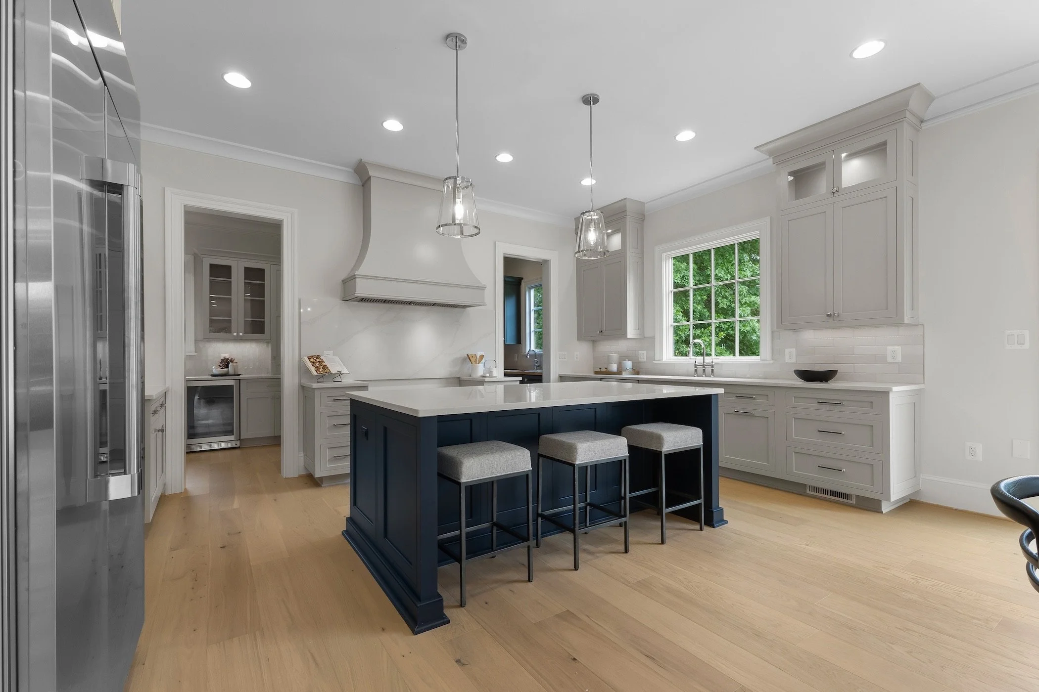 Refined finishes and intentional design shine throughout this exceptional residence. The heart of the home is a stunning St. Clair custom kitchen featuring inset cabinetry, MSI quartz countertops, GE Monogram appliances, Bridge faucets, a custom wood range hood, and statement designer lighting. A working pantry with butcher block counters and a second full-size refrigerator complements a separate butler’s pantry, offering both function and flow for effortless entertaining.