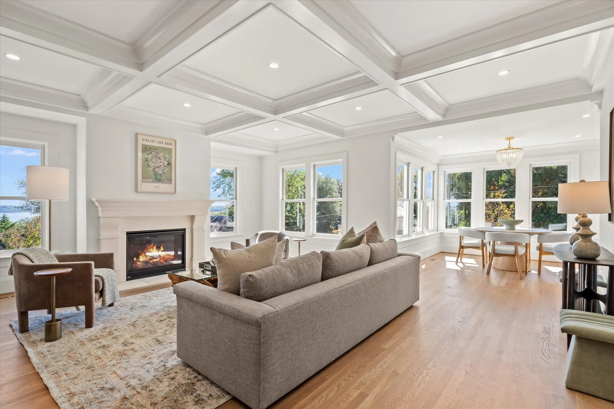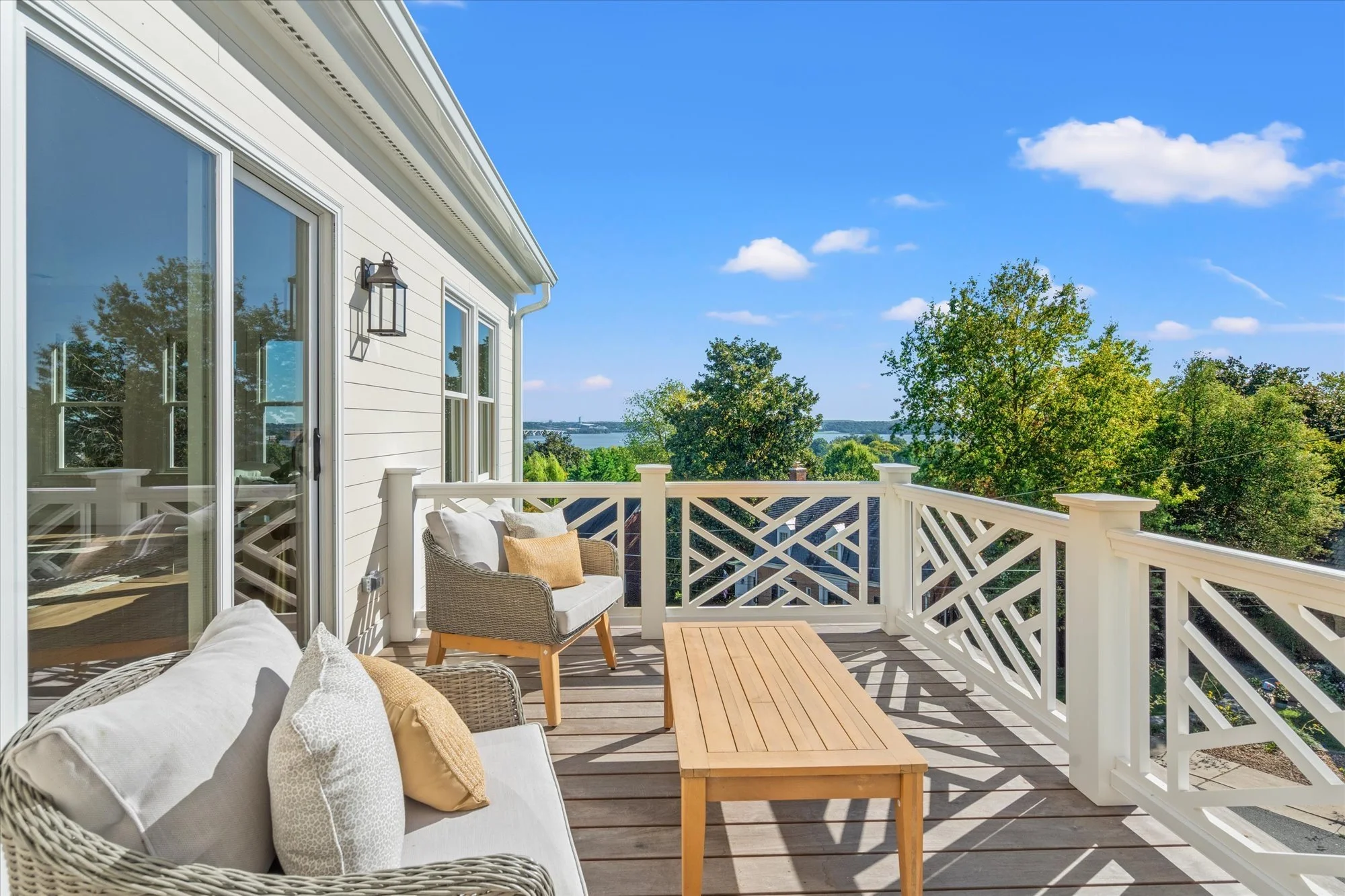 Spanning over 6,300 square feet across four finished levels, the residence includes formal living and dining rooms, an open-concept kitchen and family room, and a sun-drenched sunroom or game room. Six bedrooms, five and a half baths, and two home offices provide versatile living space. The primary suite offers a private Ipe river-view terrace with Chippendale-style railing, dual walk-in closets, a sitting room or office, and a luxurious marble bath.