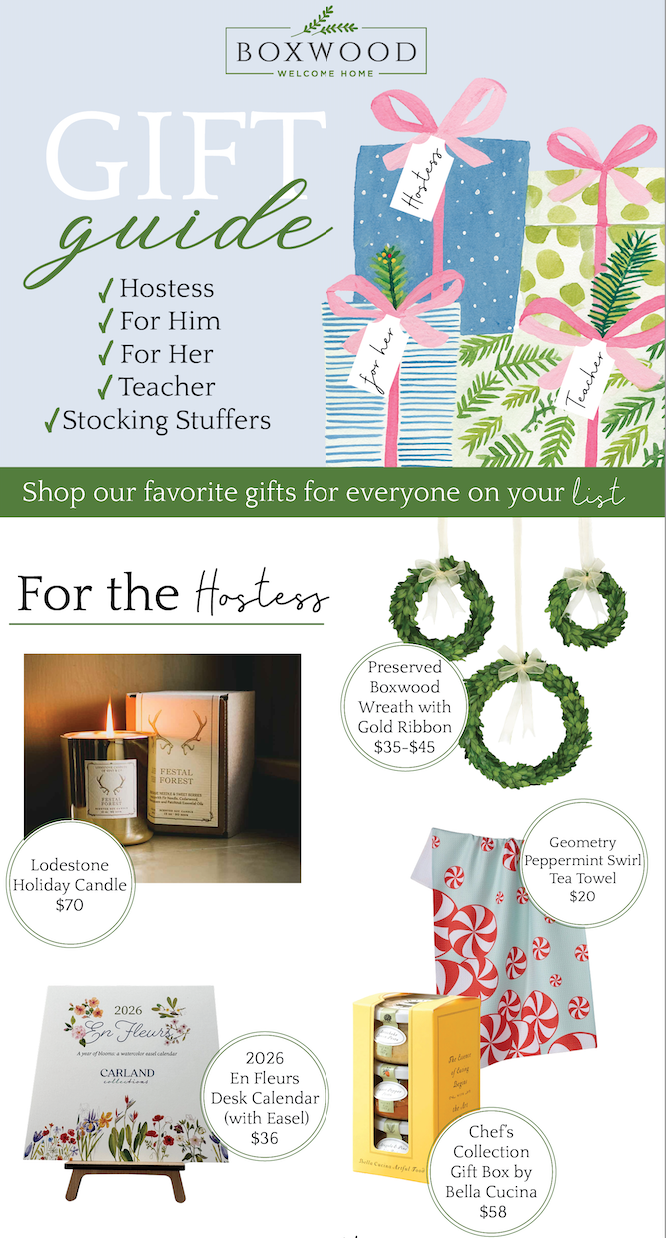 The best gifts feel like a story — a scent that calls home to mind, a color that brightens a room, a small treasure that turns everyday moments lovely. The Boxwood Holiday Gift Guide has officially arrived, filled with festive favorites for her, him, teachers, hosts, and every delightful wildcard on the list. This year’s collection brings together pretty pieces, practical gems, and joyful surprises, each chosen with real holiday moments in mind: last-minute invitations, thoughtful thank-yous, and those magical little gifts that make the season feel truly special.