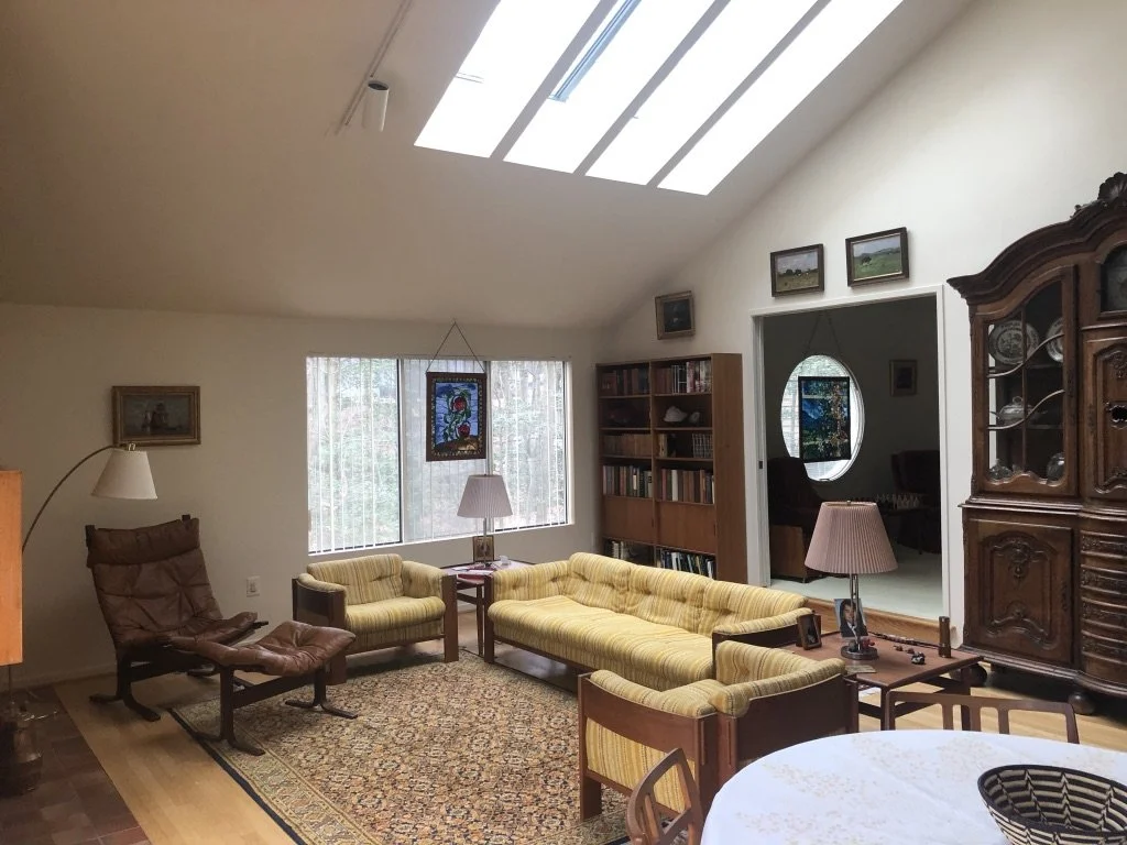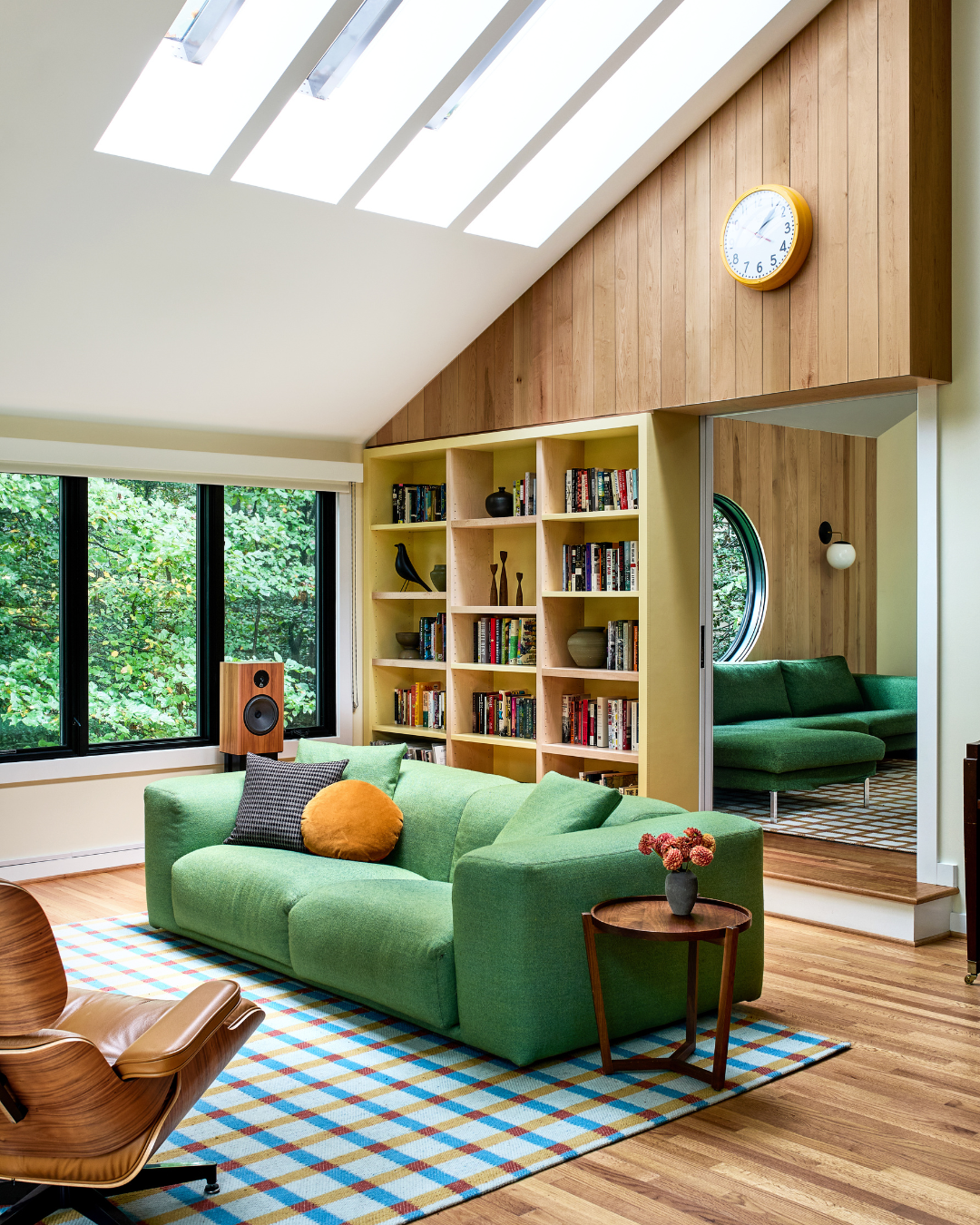 The existing living room had large skylights, which we replaced. We added built-ins with plenty of storage for books and meaningful items. The vertical maple paneling over the bookshelves adds warmth and architectural interest in this soaring space. We repeated this maple paneling in the family room, highlighting the existing circular window.