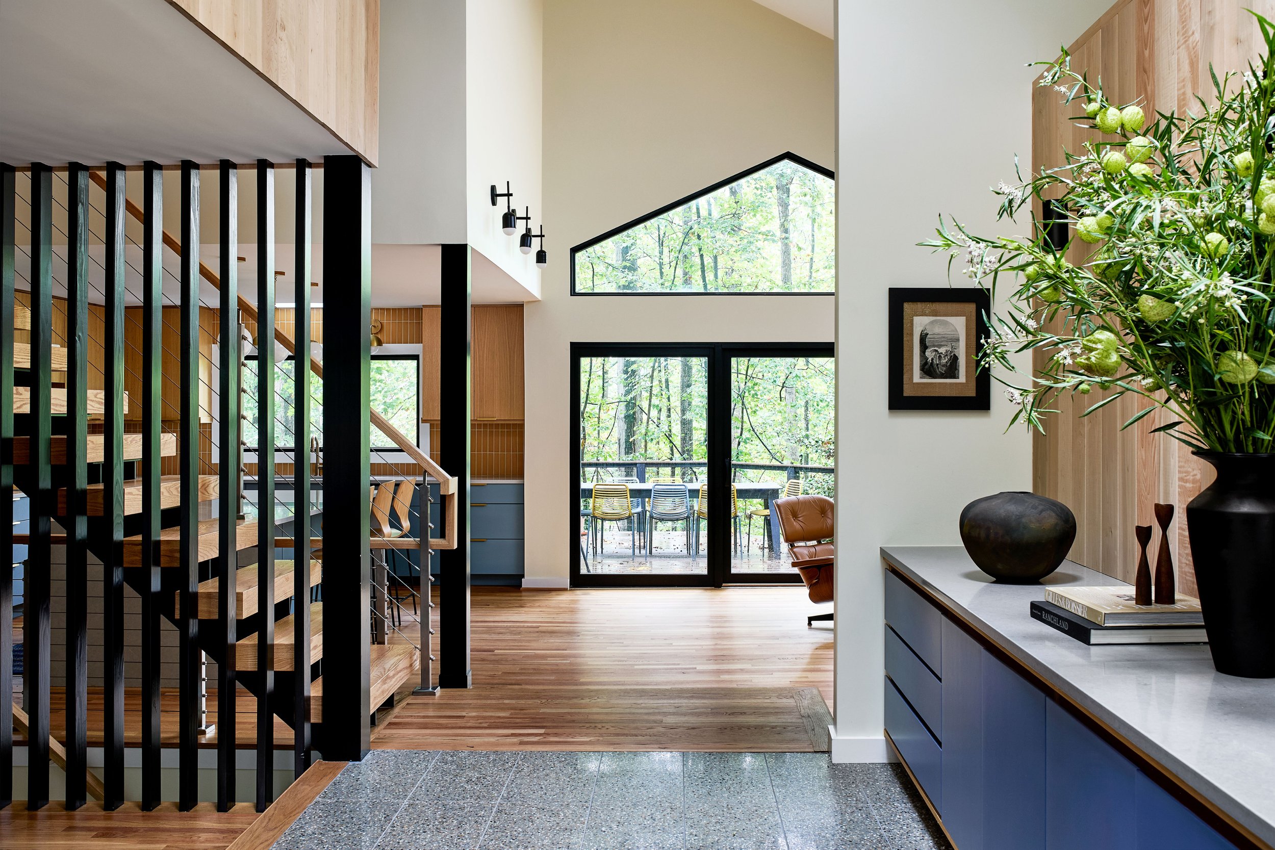 We also reworked the foyer, enlarging it to create a welcoming space with plenty of storage, clerestory windows, and “wow” views that connect the house.