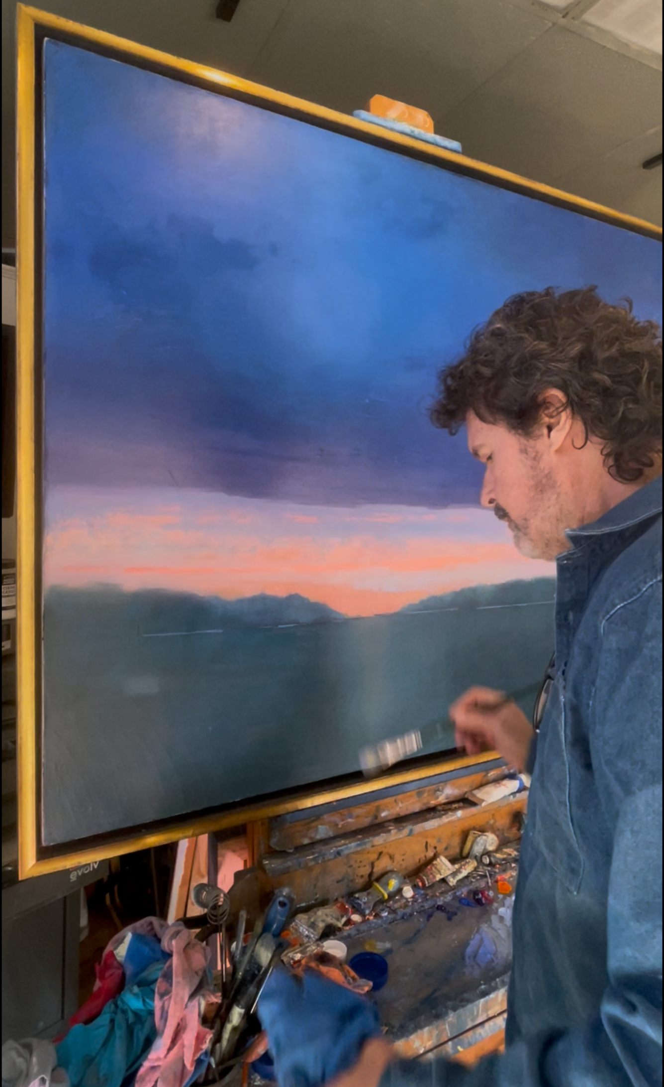 This painting isn’t of Santa Fe, but what I saw there changed how I approached it. Glazing King’s Blue over the orange paint cooled the orange just enough, and a small teal edge along the storm front suddenly echoed the feeling I had looking out over the Santa Fe hillside.
