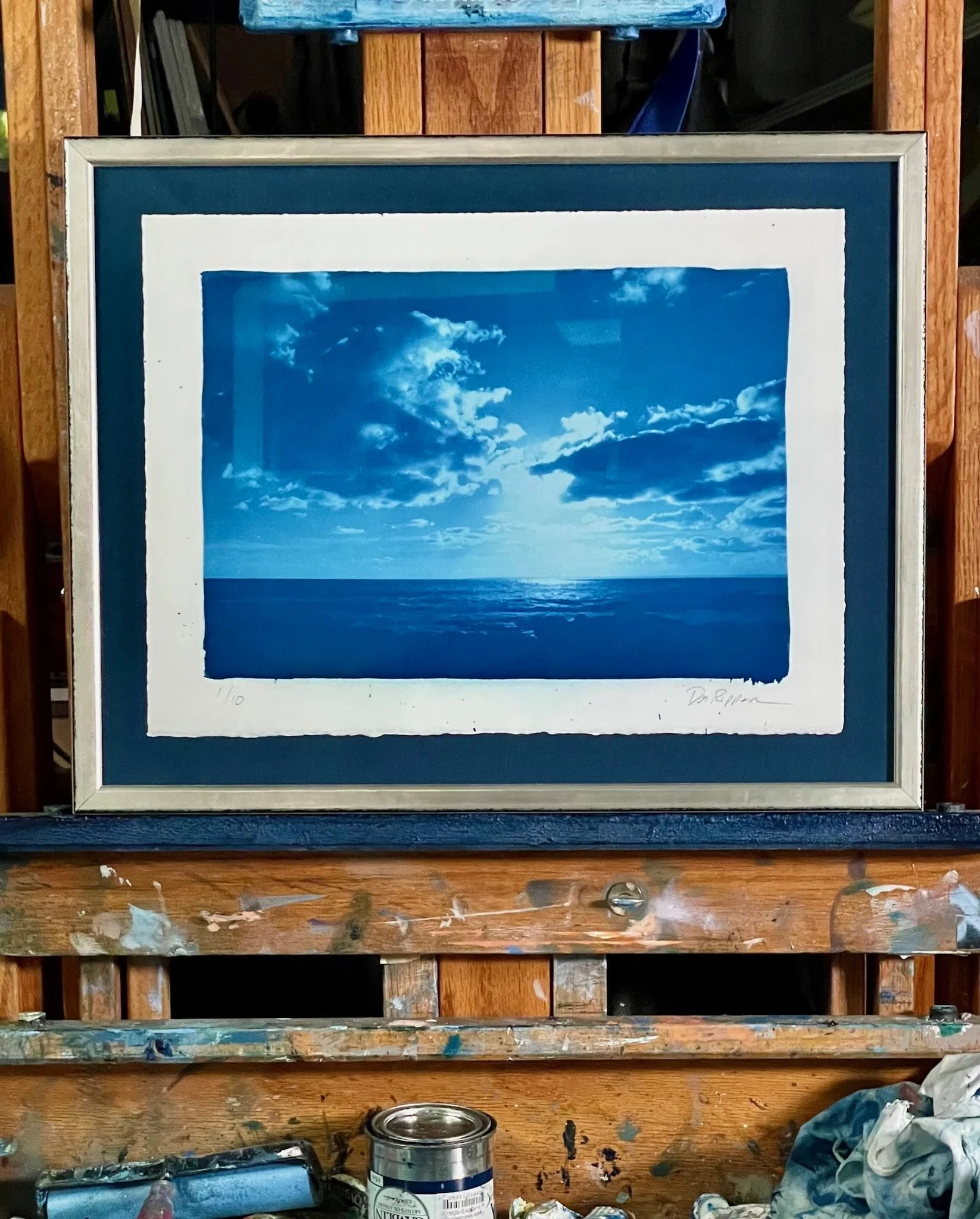 “Lamoine Beach” Cyanotype on paper floated onto a deep blue silk mat exposing the papers deckled