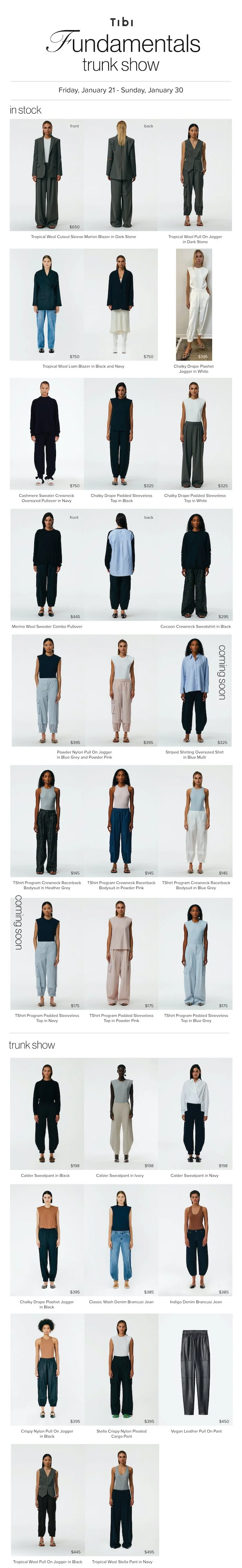In the next few weeks (and really months) in Stylebook, we are going to breakdown down some of these terms and how you can make Tibi work in your wardrobe. To kick off our Tibi lovefest, we are hosting a trunk show featuring their Fundamentals Collection for spring. Another term she uses to describe how these pieces will work in your life is WOFs, short for "Without Fails." These are the items that you know you will always feel good in. The pieces that can be dressed up or down, the pieces that you can often wear all year round. They are the first things you pull out of your closet when you are packing for a trip, and in my case, it also includes the piece I am so annoyed I sent to the cleaners and forgot to pick up. For me, these are my chalky drape and nylon joggers. I wear them all the time. In the winter, I layer leggings underneath the nylon for warmth. They are on repeat. I had a panic attack once when I couldn't find them, so I got a backup pair; I wear them that much.