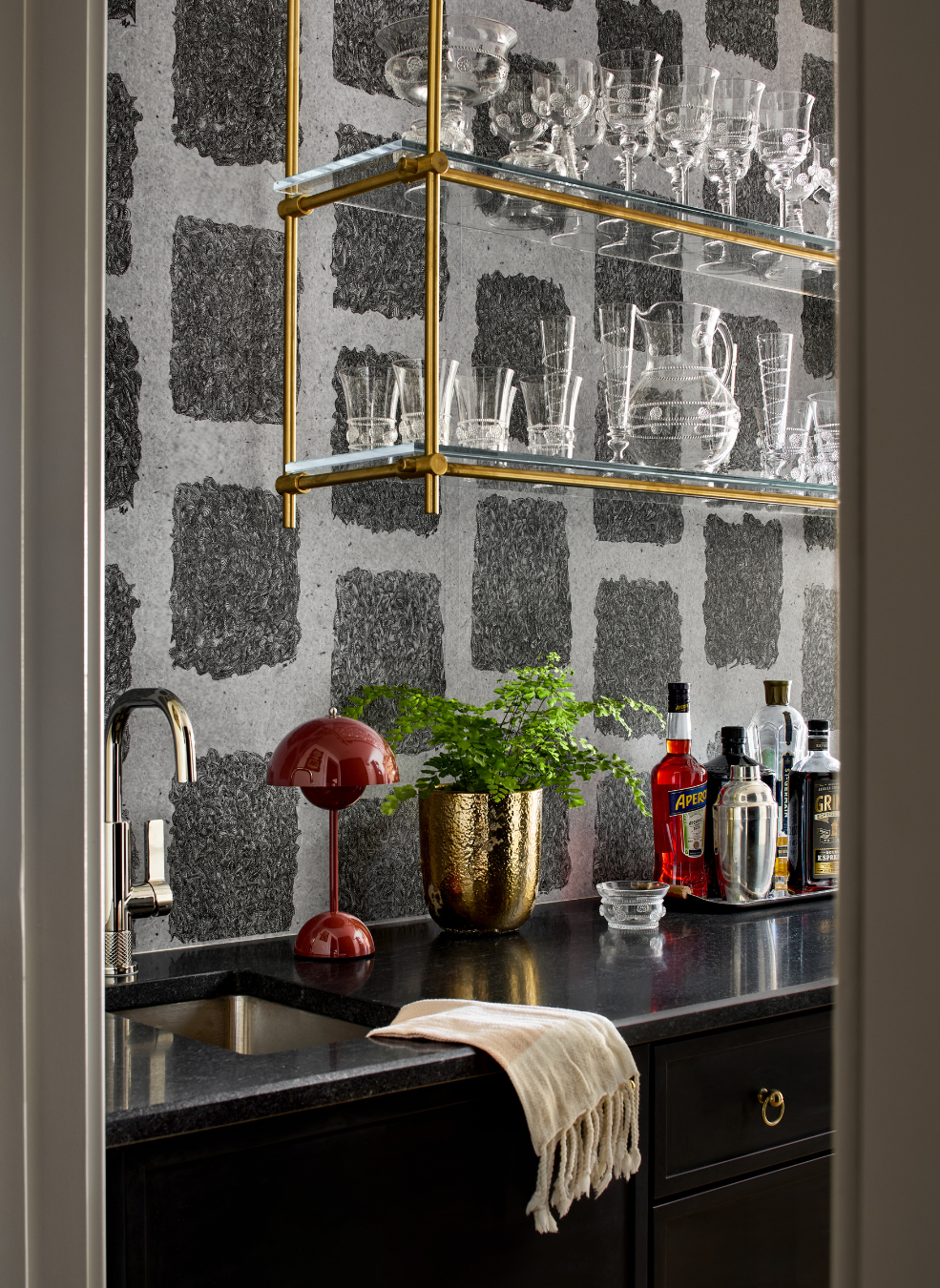 “We had my dad’s artwork—doodles he did over years—turned into wallpaper for the space,” she says. “It makes me smile every day thinking about his legacy and then seeing my mom’s crystal on the shelves in that space alongside my own is very meaningful.”