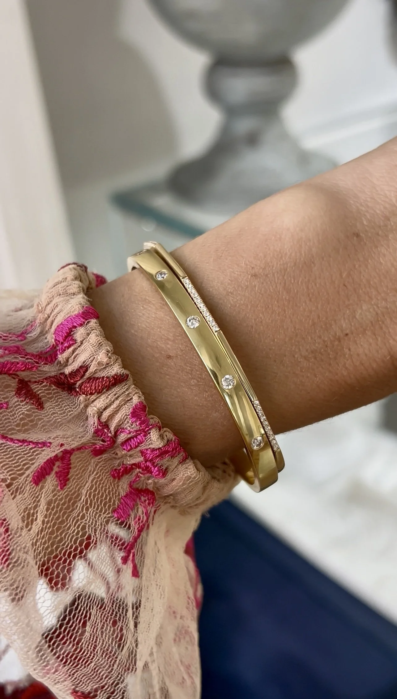 Among the standouts is a luminous cabochon moonstone enhancer by designer Mazza, bezel set and surrounded by pink tourmalines for a soft yet striking glow. For a bold declaration, an 18K gold diamond LOVE bracelet features round brilliant-cut diamonds set in a burnished style—timeless, elegant, and unmistakably meaningful.