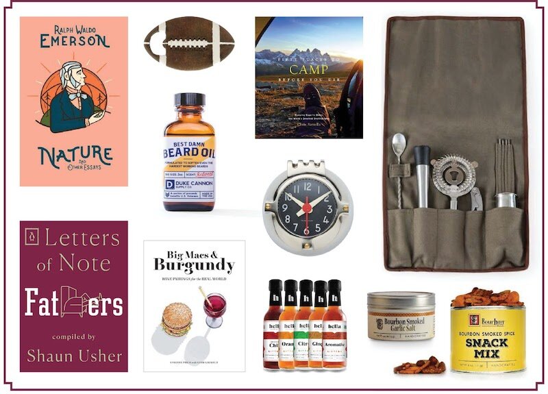Shop these items from Red Barn Mercantile: Nature and Other Essays, $16.99; Football Bottle Opener, $12; Fifty Places to Camp, $24.95; Bar Tools, $49; Best Damn Beard Oil, $32.50 Wall Clock, $85; Letters of Note: Fathers, $15; Big Macs & Burgundy, $27.50; Hella Bitters, $22.50 each; Bourbon Smoked Garlic Salt, $12; Bourbon Smoked Spice Snack Mix, $15.