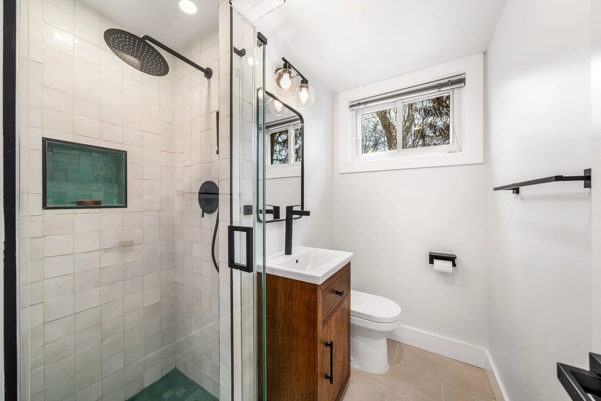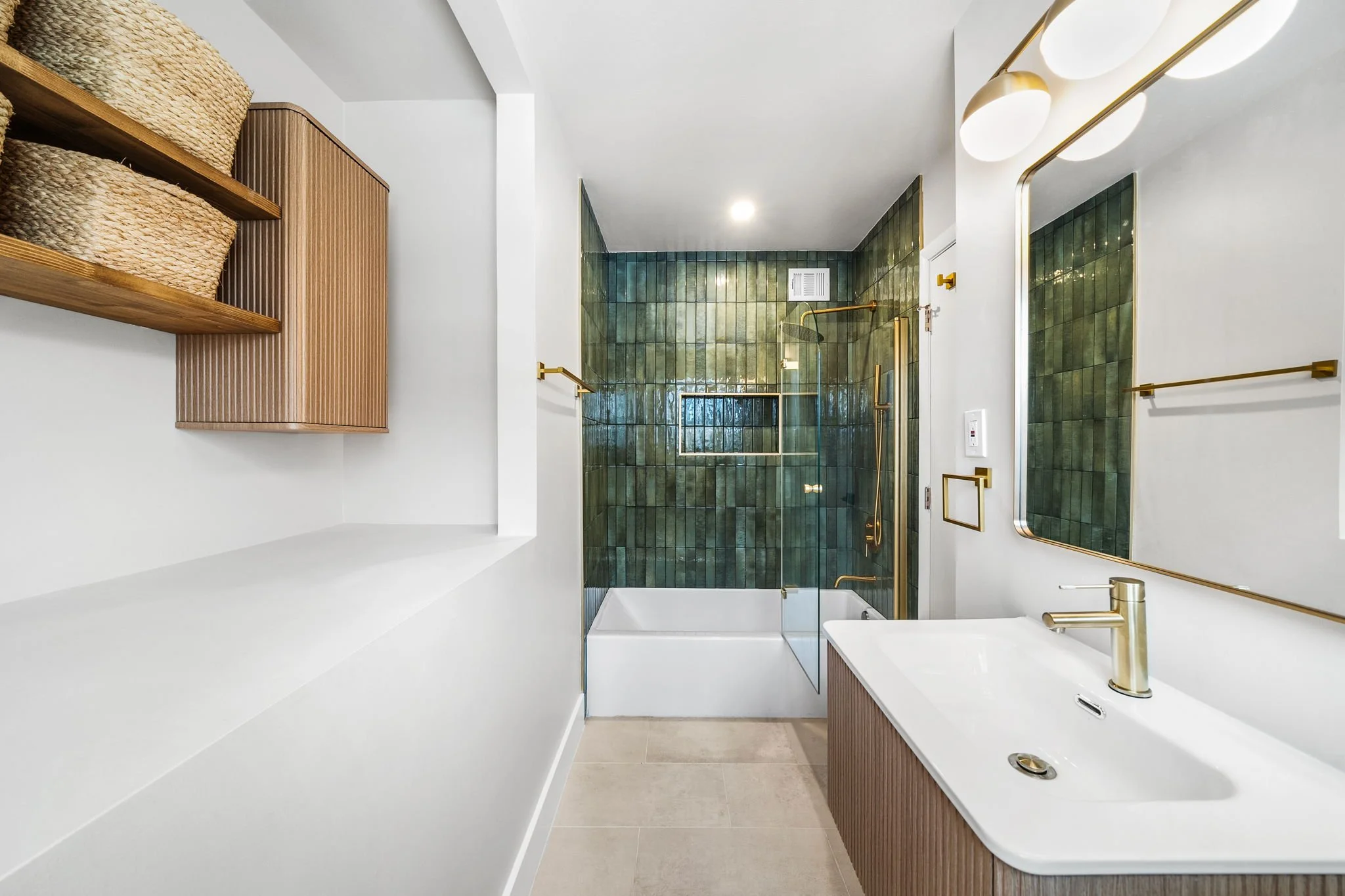 Two fully renovated bathrooms exude spa-like elegance. The primary bath upstairs is flooded with natural light and features a striking shower of glossy green subway tile with gold fixtures. Three upper-level bedrooms are complemented by a convenient half bath.