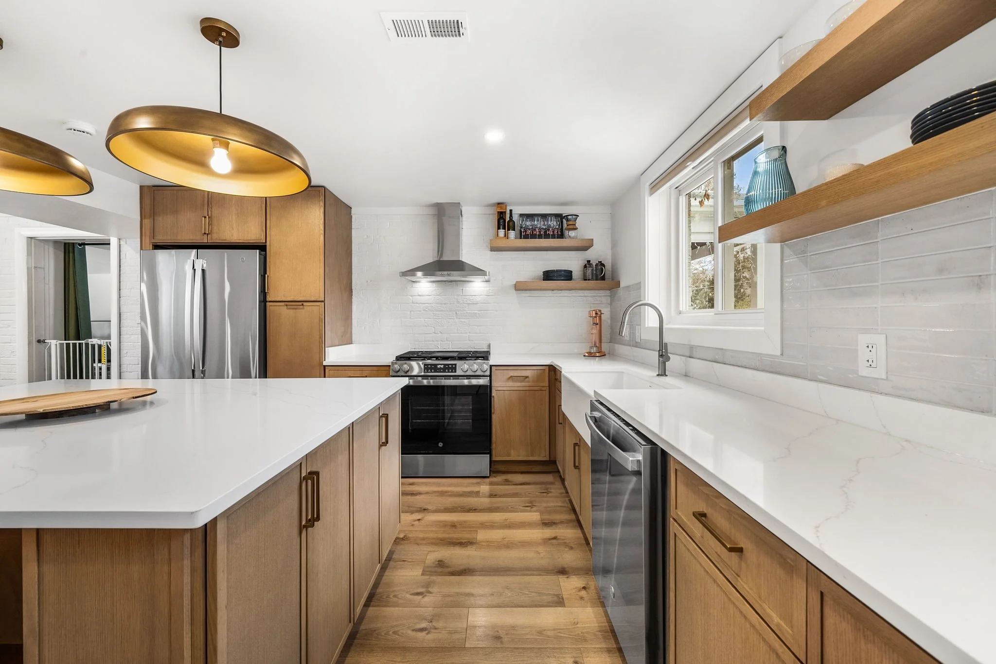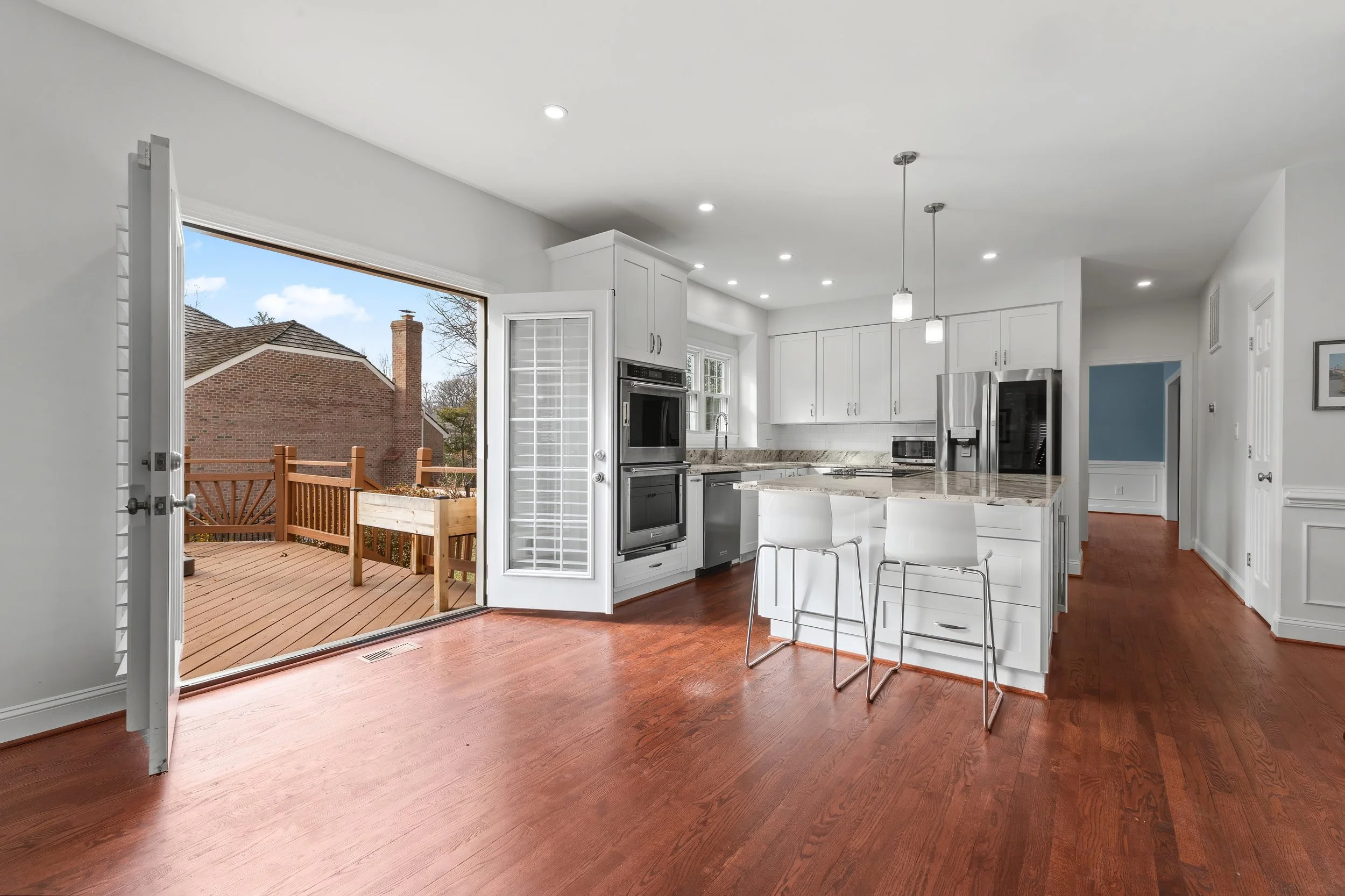 This exceptional 4-level expanded split-level residence offers 3 bedrooms, 2.5 bathrooms, and 2,544 square feet of thoughtfully designed living space on a prominent corner lot, directly across from Waynewood Elementary School in one of Fort Hunt's most established communities. The newly renovated kitchen and dining area serve as the home's centerpiece. White subway tile, floating shelves, a stainless steel hood, and a farmhouse sink framed by a large window create a refined yet welcoming aesthetic. A generous island with seating for two flows into a dining space with an adjoining play/flex area.