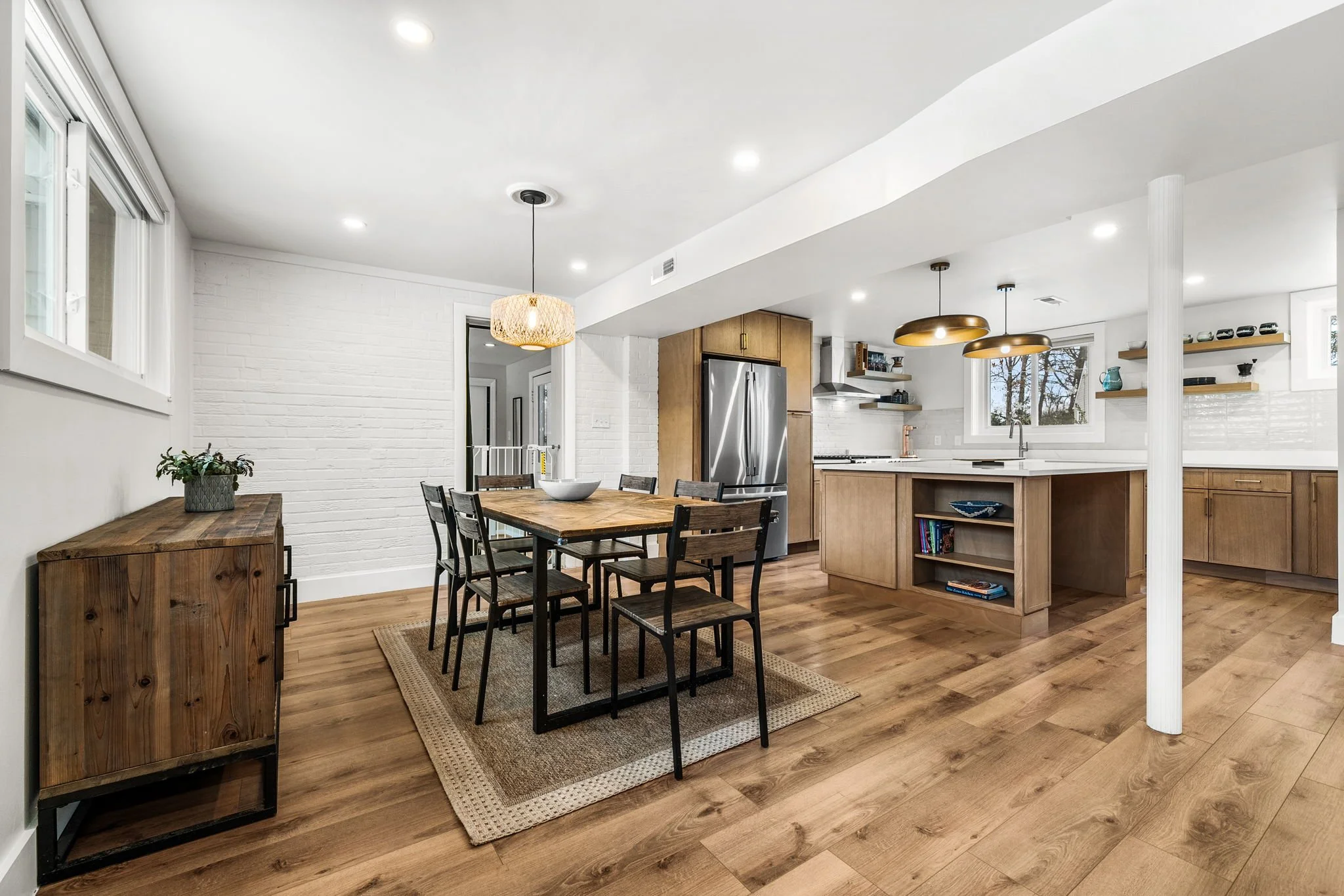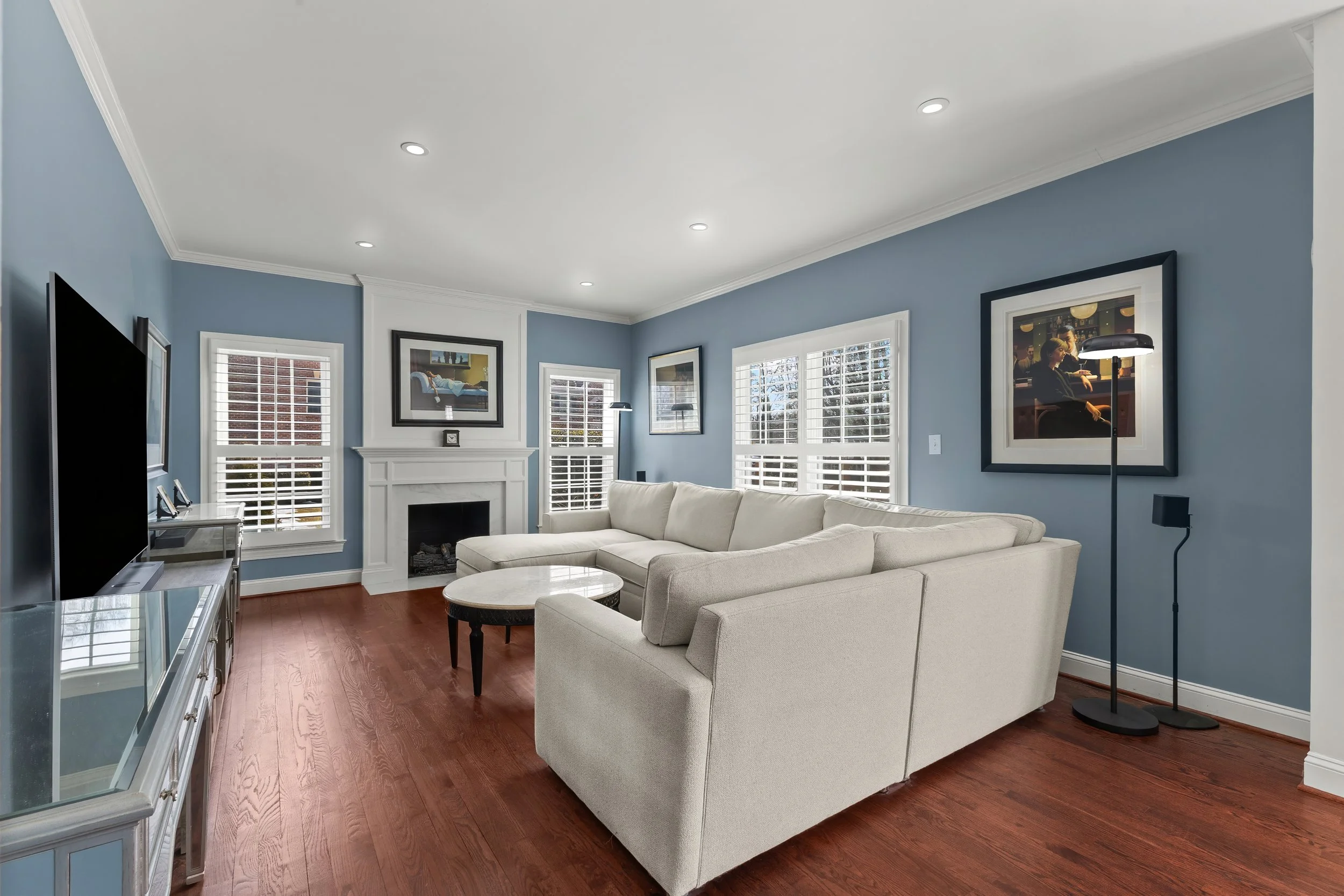 The main level is filled with natural light and showcases refinished hardwood floors, new plantation shutters, and fresh paint throughout. The living room is anchored by a gas fireplace with a custom-designed surround and marble inlay installed in 2024, creating a refined focal point with an improved layout achieved by reimagining the main level to enhance flow and provide better access to the deck to maximize indoor-outdoor living and functionality for entertaining. Recessed, color-changing LED lighting with programmable Lutron dimmers has been added to the main level and basement for modern convenience. The open kitchen connects seamlessly to the surrounding living and dining spaces and features under-cabinet lighting and a new dishwasher (2023).