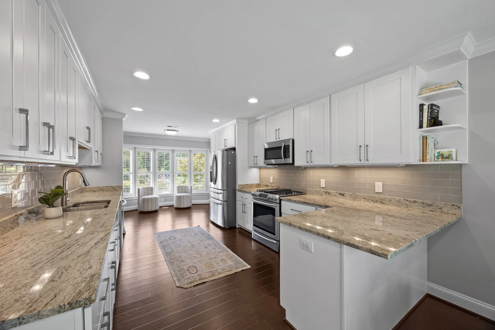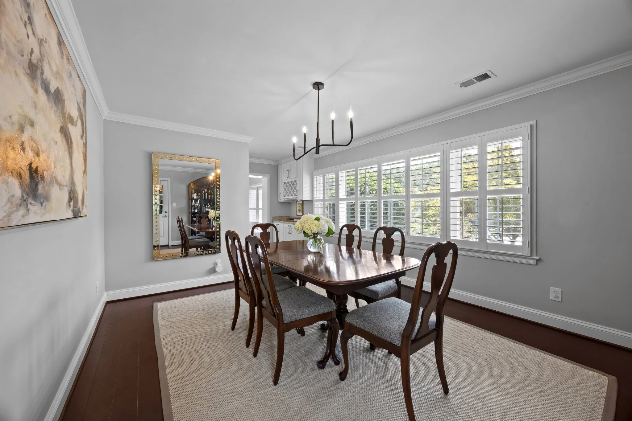 Inside, natural light pours through large windows, highlighting hardwood floors, crown molding, and a neutral color palette. The spacious living room overlooks the backyard, while the gourmet kitchen features granite countertops, stainless steel appliances, white cabinetry, a subway tile backsplash, and sliding doors that seamlessly connect to the back patio—ideal for indoor-outdoor entertaining. A formal dining room with a bar/butler’s station provides the perfect setting for gatherings, and a mudroom with cubbies offers everyday convenience.