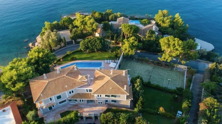 Set on pristine grounds with lush gardens, a saltwater pool, and an underground tunnel that leads directly to the beach and private jetty, this home is designed for coastal relaxation. For tennis lovers, there’s a private court ideal for afternoon matches with the Aegean Sea as your backdrop. With nine bedrooms, ten bathrooms, and two guest houses, this is a rare seaside retreat that offers both serenity and sophistication.