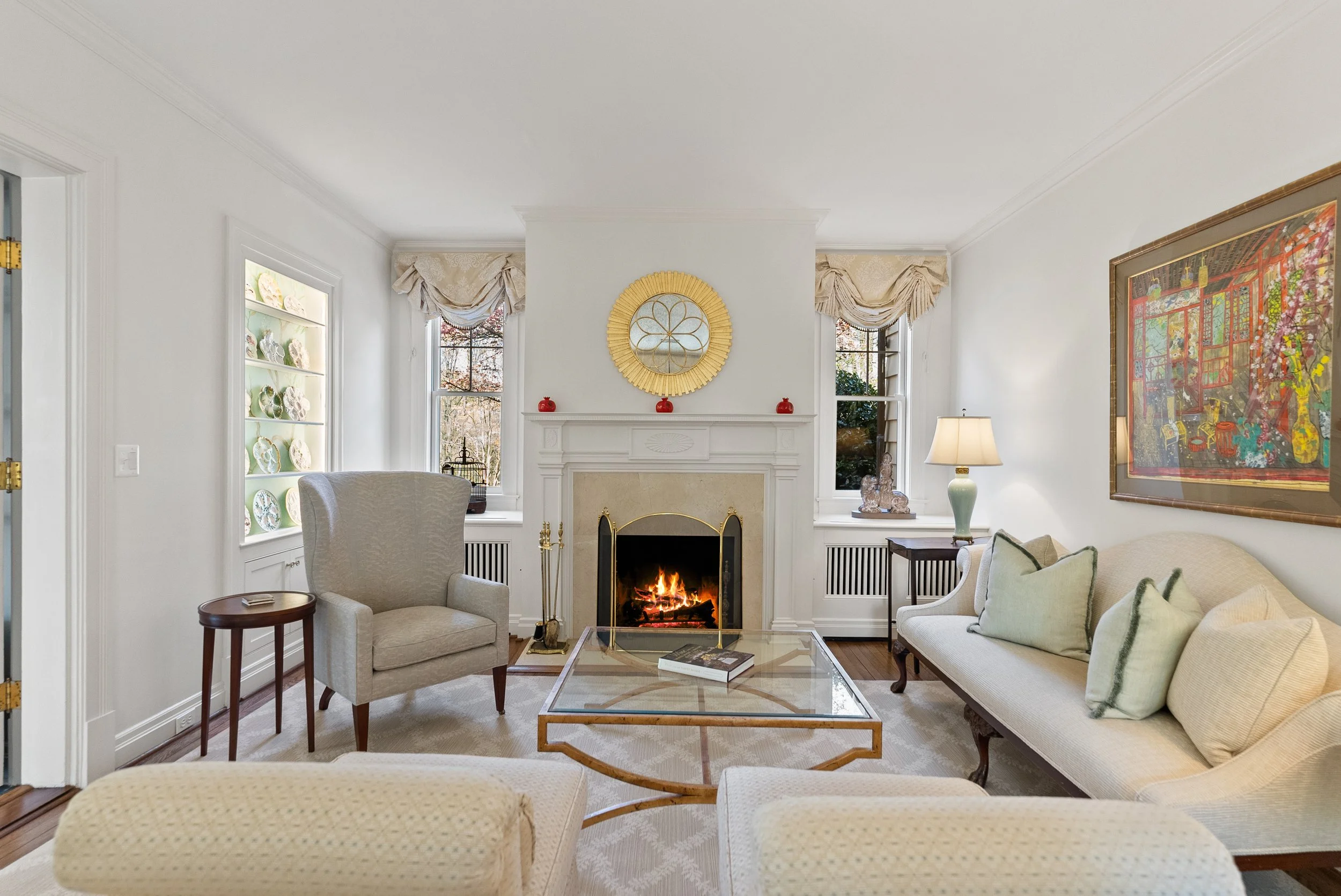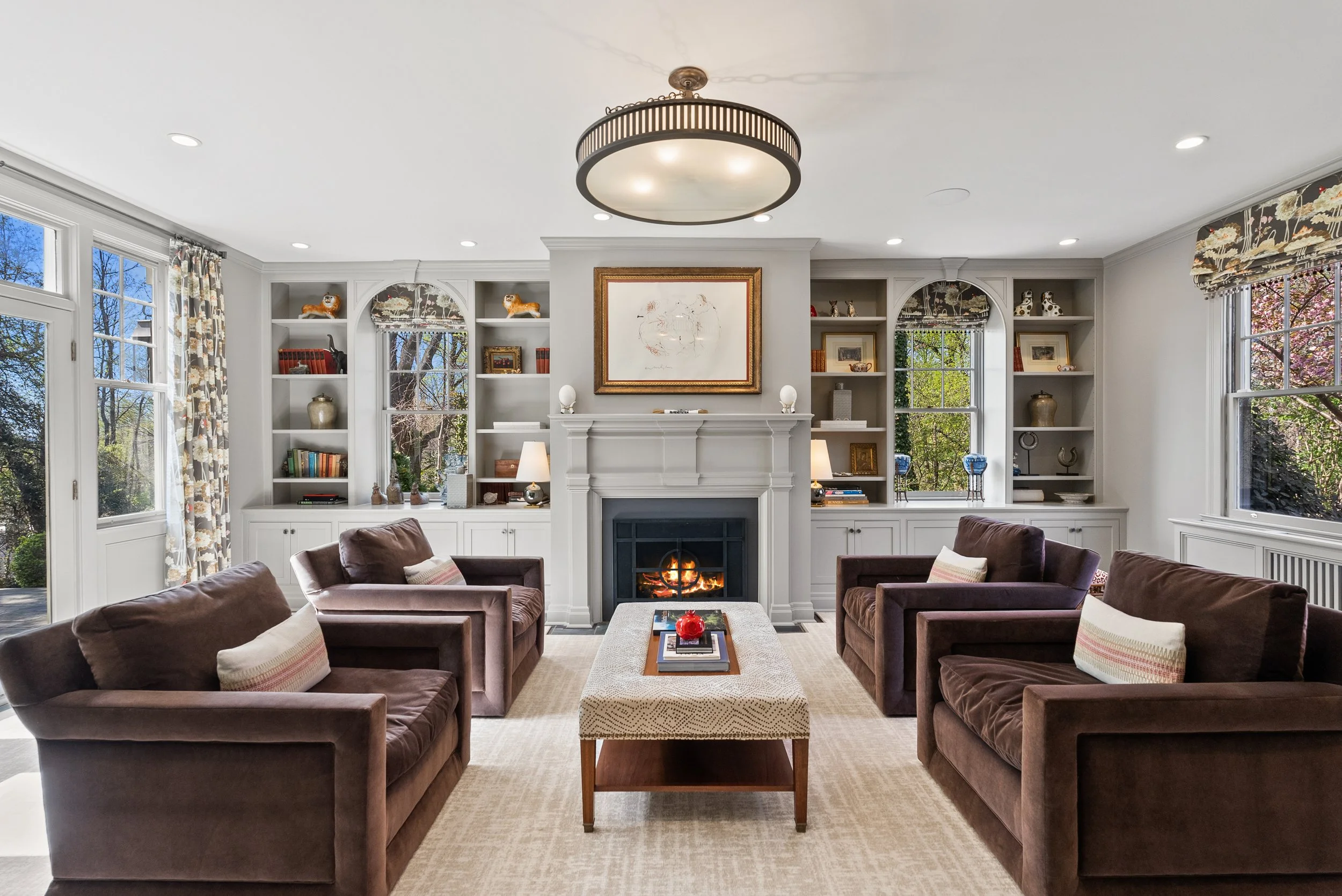 Inside, the home offers 4/5 bedrooms, plus a charming play and attic bunkroom, along with renovated marble baths. Elegant formal spaces include a library and living room each anchored with a gas fireplace, and a dining room for grand entertaining, complemented by an impressive family room featuring heated glazed slate floors, bespoke millwork and a wood-burning fireplace.
