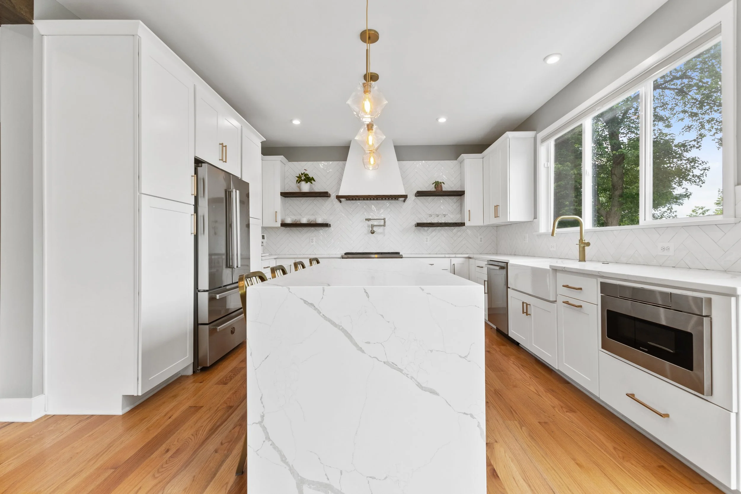 The designer and chef-grade kitchen is equipped with a Bertazzoni 36-inch dual fuel range (6 gas burners with an electric oven) with a custom range hood, 4 open shelves, and a pot filler. It also includes a 30-inch white fireclay farm sink, quartz countertops with a waterfall island, Wolf brand soft-close cabinets, West Elm pendant lights, an oversized subway backsplash laid in a herringbone pattern, and a Bertazzoni 4-door fridge and dishwasher. The main level also offers a stacked stone gas fireplace, exposed wood beams, a sunny office, and a charming powder room. Exterior features include a poured concrete driveway, a fully fenced backyard, an expansive Trex deck, a welcoming front porch, a concrete patio, Hardie and vinyl siding, a stacked stone front, a landscaped yard, and double-pane Jeld-Wen windows.