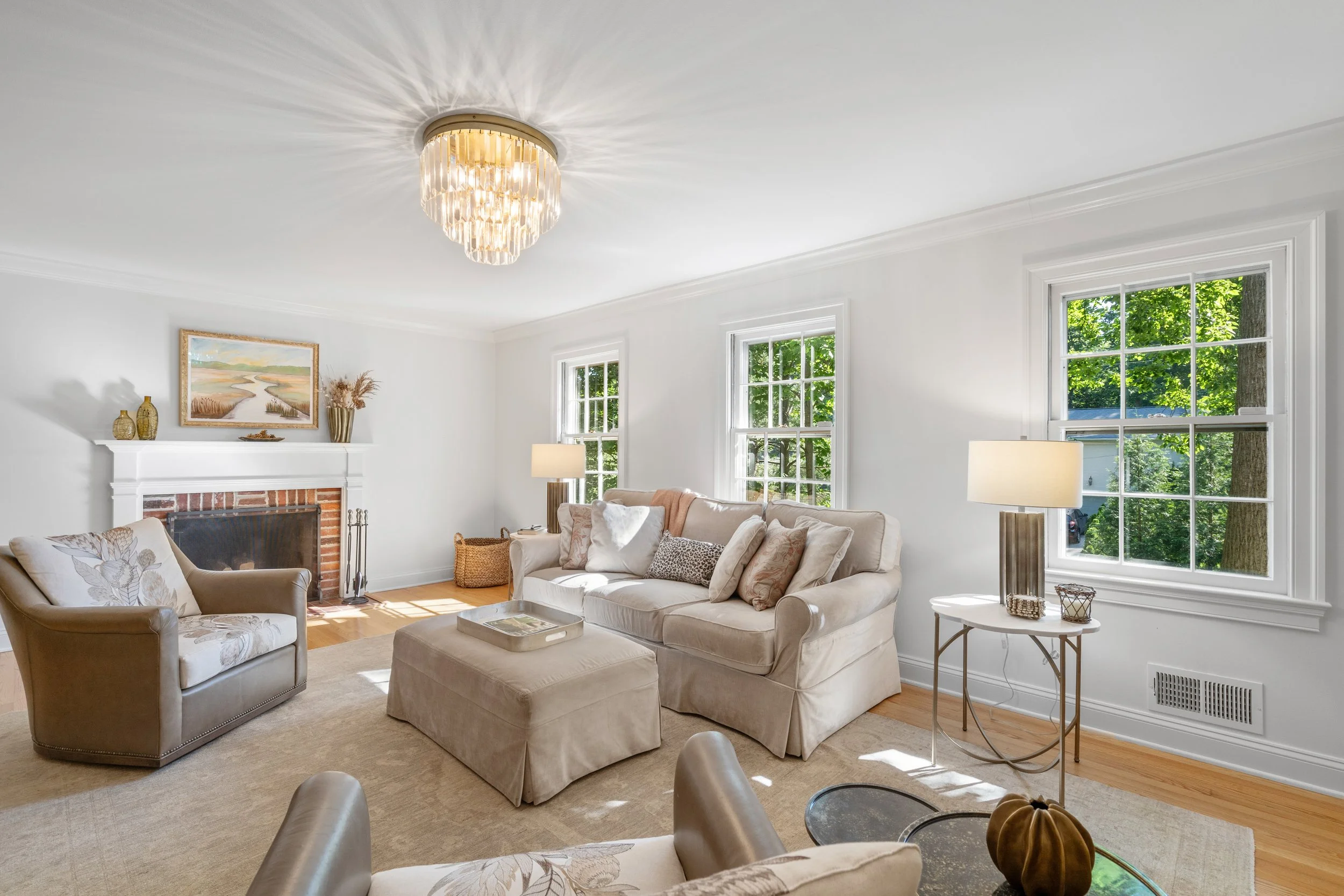 Designer lighting and hardware adorn the home, with refinished hardwood floors and added crown molding throughout. Recent updates include a new roof (2016), HVAC (2019), and a 75-gallon gas water heater (2017). The bathrooms have been recently renovated, and the home features a floored attic and a new chimney liner (2018). The lower level, with full windows and a walkout, can easily serve as an in-law or nanny suite.
