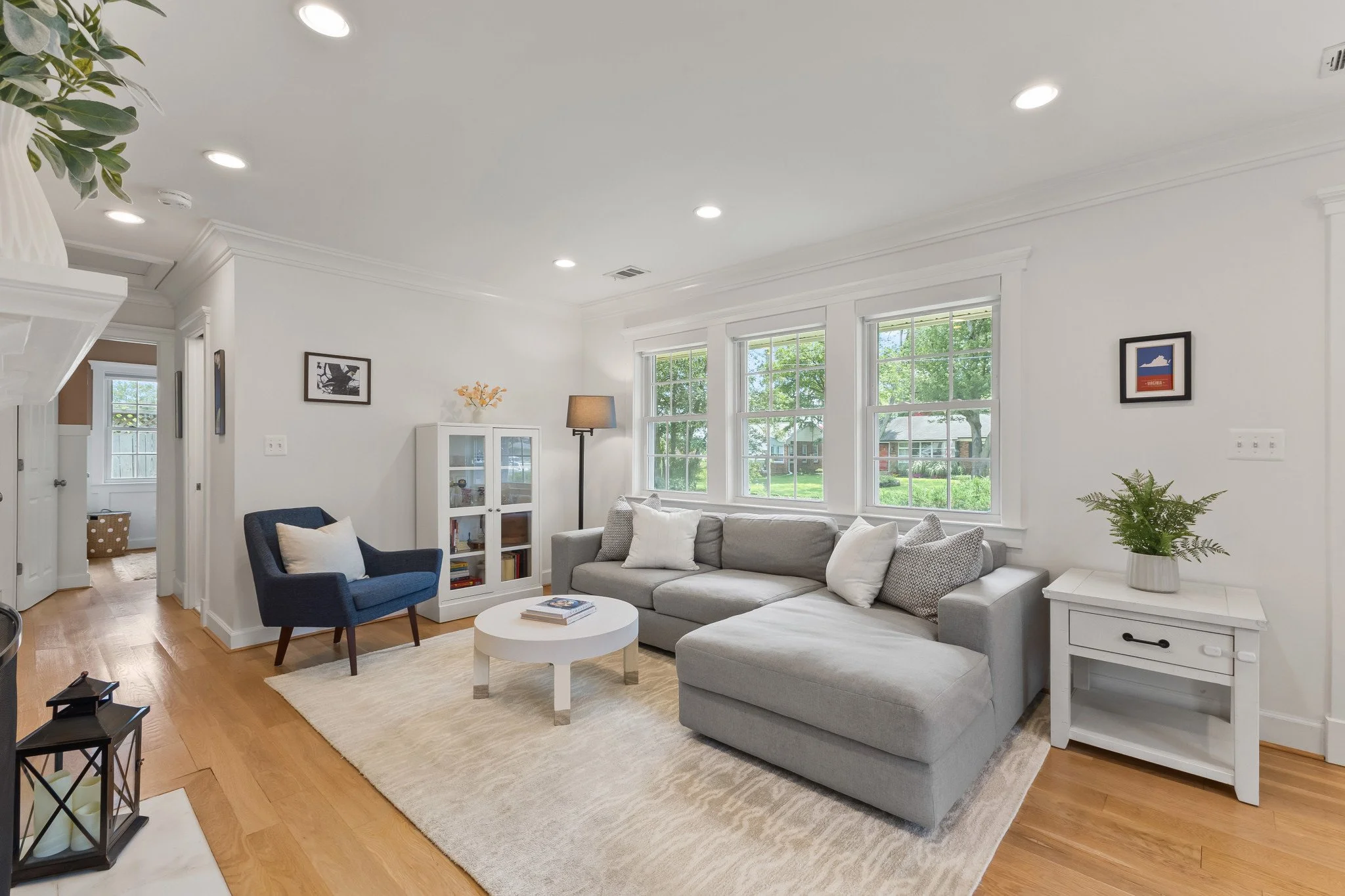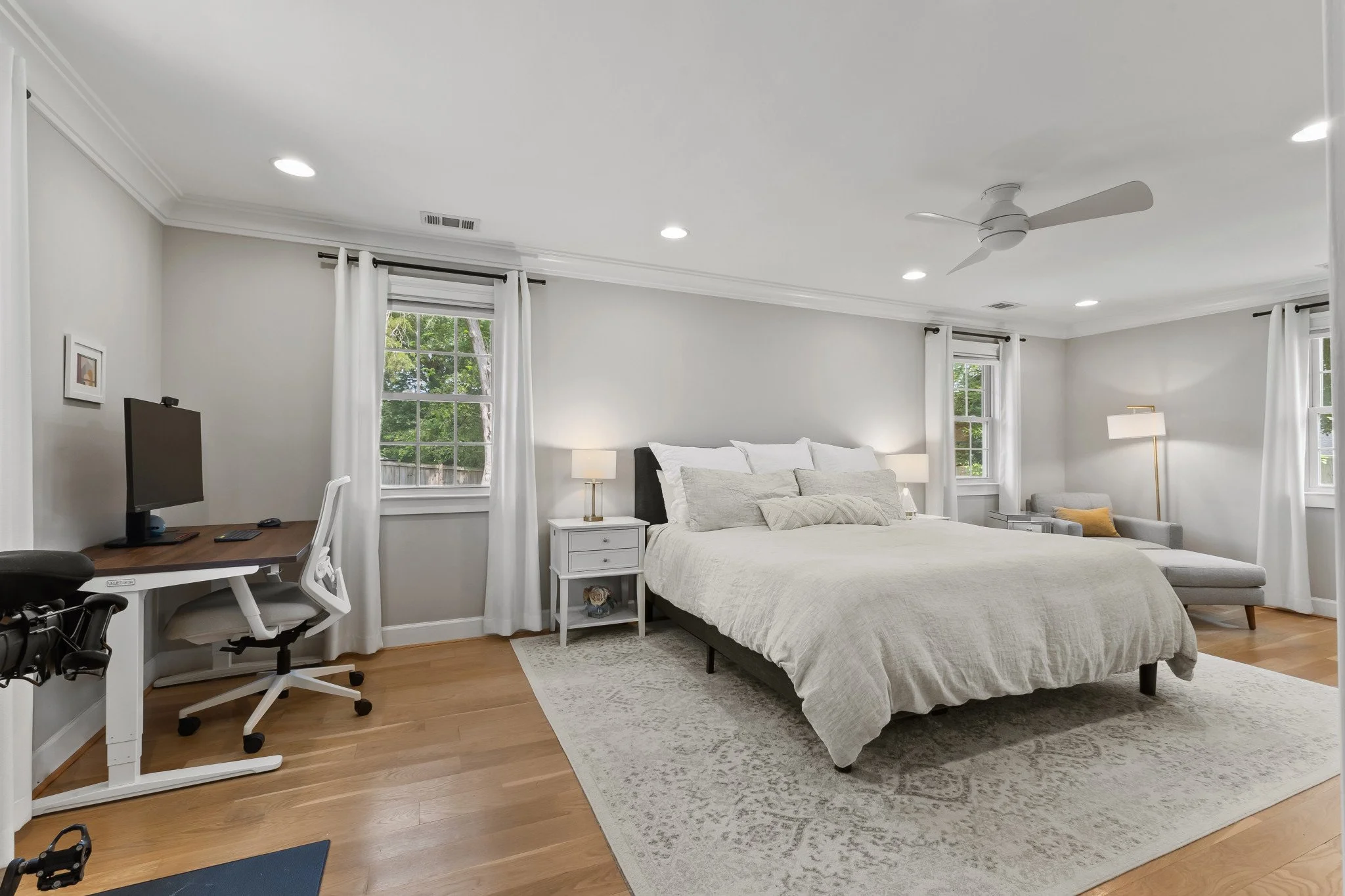 Hardwood floors, neutral paint, and recessed lighting throughout