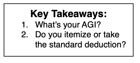 You start with your gross income, which can have some adjustments, and then arrive at your Adjusted Gross Income. For those just filing your taxes, this can be found at the bottom of page 1 on your Form 1040. Your Adjusted Gross Income, or AGI, matters because it is often used for thresholds for certain deductions or benefits when they’re phased out at higher income – or higher AGI – levels.